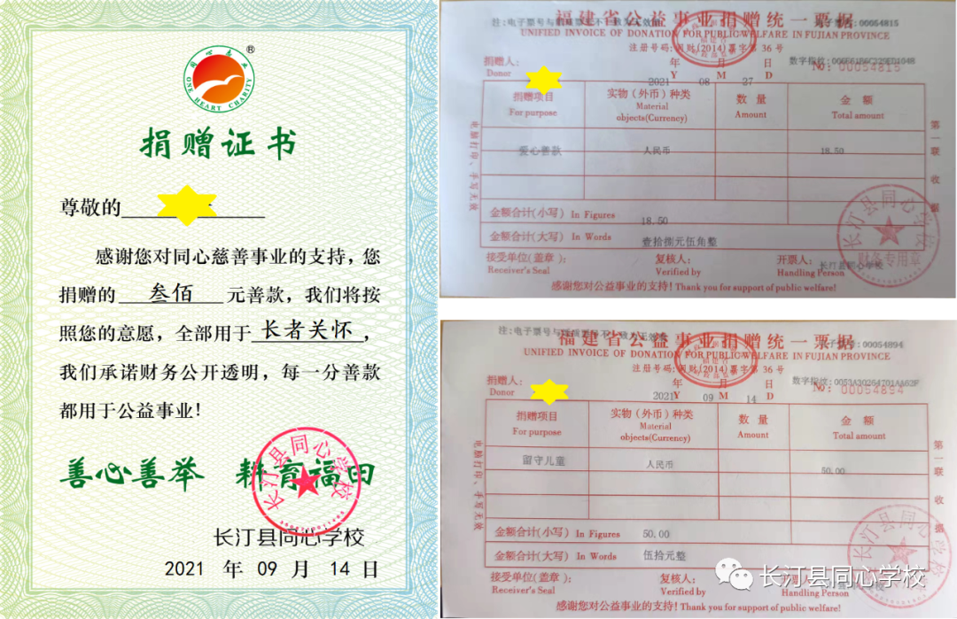 对任何一笔捐赠,不论金额大小,同心学校均会开具合法的电子捐赠票据,并制作 电子版 捐赠证书,根据捐赠人需求提供纸质版证书。每月一次在公开合法的网络平台对捐赠的每一笔善款及物资进行公示。