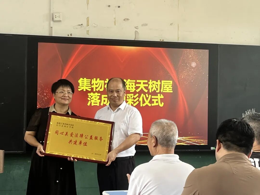 在为汀龙律师事务所进行授牌仪式时,施校长表示,汀龙律师事务所的加入,为同心学校带来了宝贵的法律资源和专业支持。同时向汀龙律师事务所表示衷心地感谢。感谢他们对教育事业的关心和支持,共同为孩子们的健康成长和法治教育贡献力量。