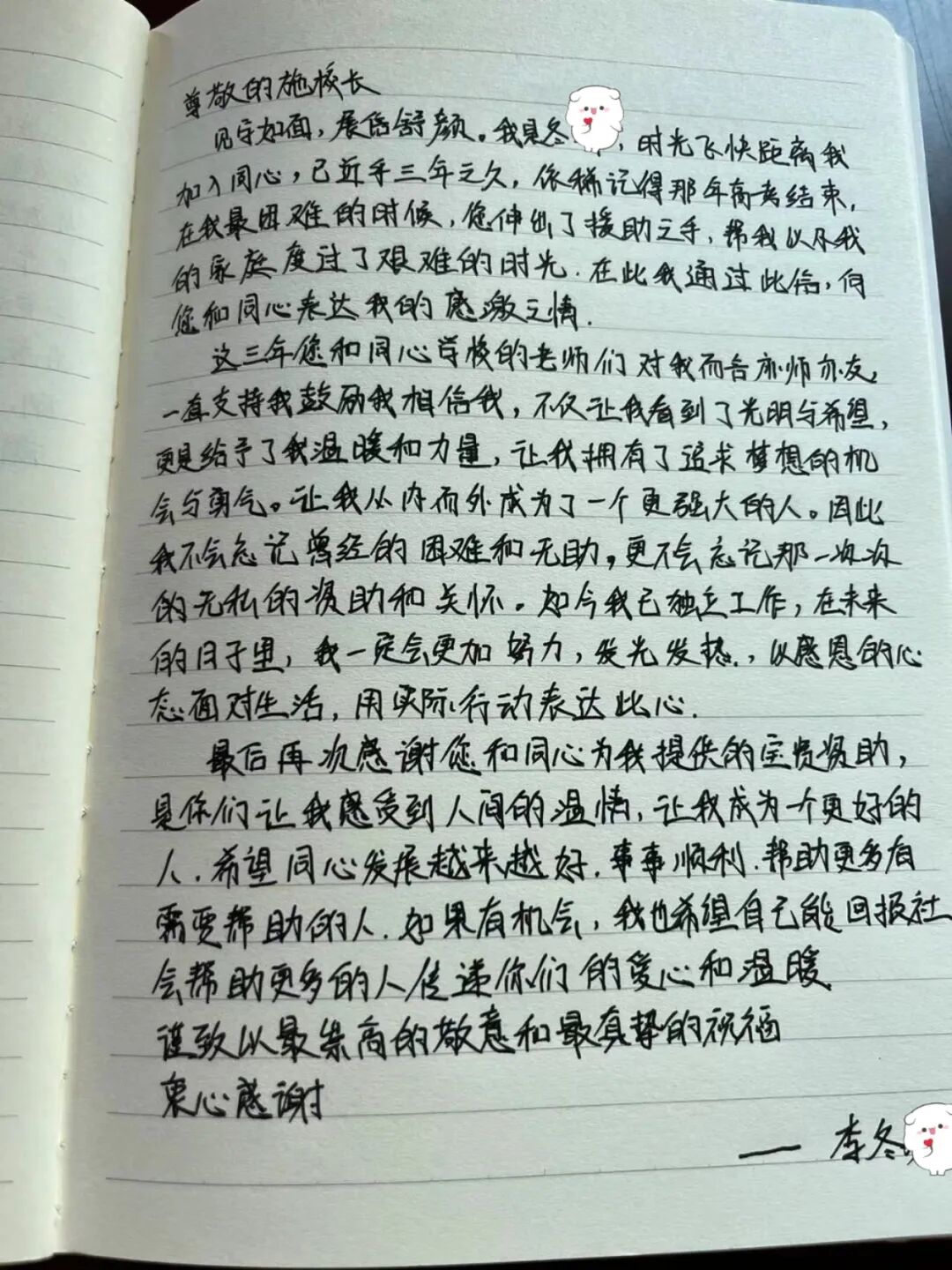 我是小冬,时光飞快,距离我加入同心,已近乎三年之久。依稀记得那年高考结束,在我最困难的时候,您伸出了援助之手,帮我以及我的家庭度过了艰难的时光。在此我通过此信,向您和同心表达我的感激之情!
