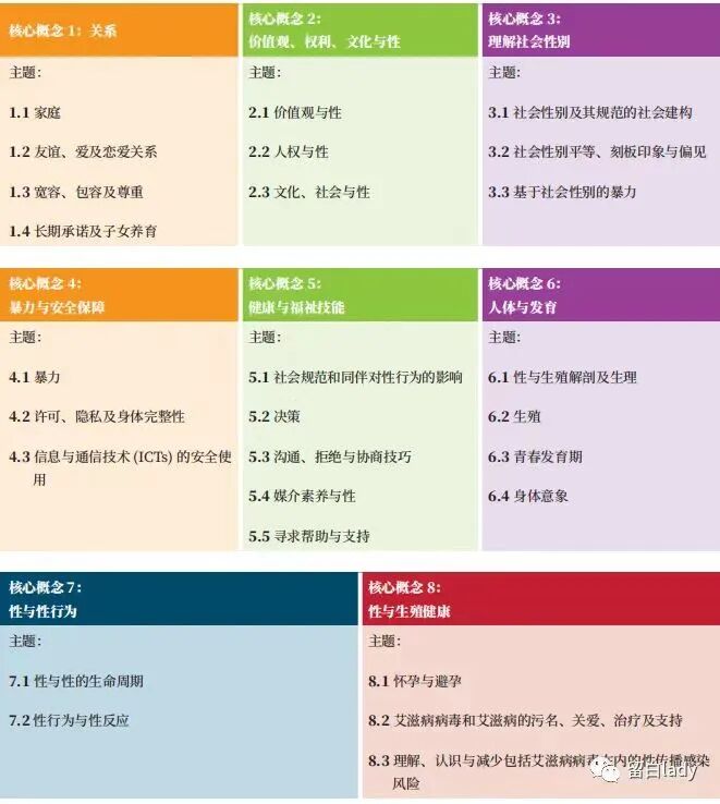 真正的性教育包含以下八个关键主题,细分到不同的年龄段,每个主题都有关于知识、态度与技能的学习目标。