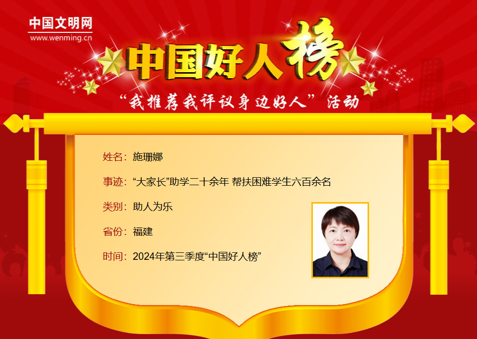 11月12日,2024年第三季度“中国好人榜”发布仪式暨全国道德模范与身边好人现场交流活动在湖北省十堰市举办。龙岩市施珊娜荣登2024年第三季度“中国好人榜”。